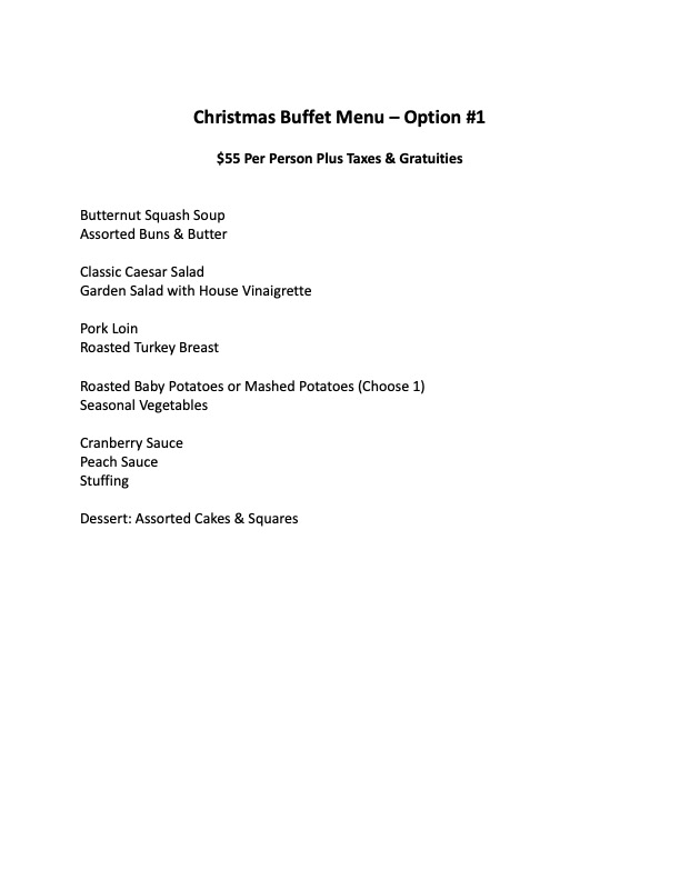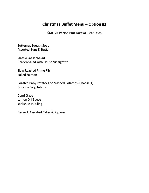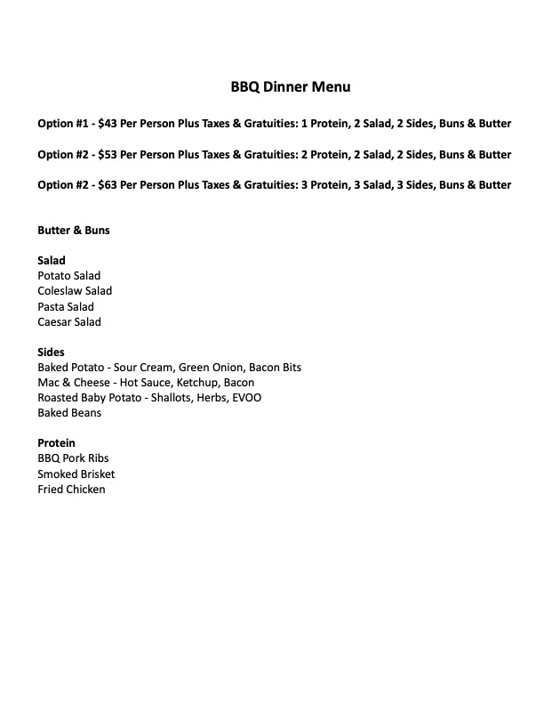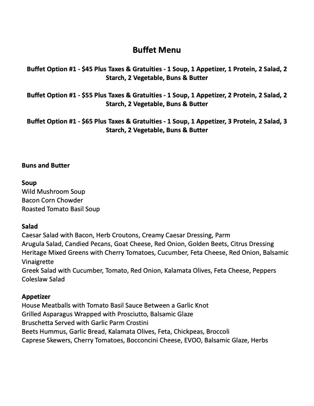 Dinner Menus Including Appetizers, Buffet Style Service, and Plated Service may be designed to your request.