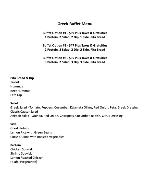 3 Proteins, 2 Salads, 4 Sides, Pita & Tzatziki